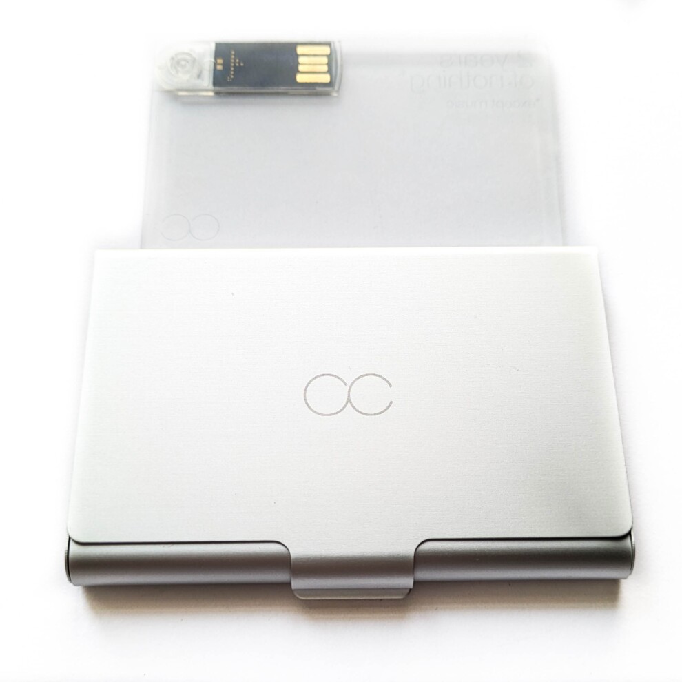 Это буквально наша визитная карточка — прозрачная флешка в форме визитной карточки, выполненная в классическом минималистском стиле, помещенная в кардхолдер из нержавеющей стали с лазерной гравировкой логотипа.
