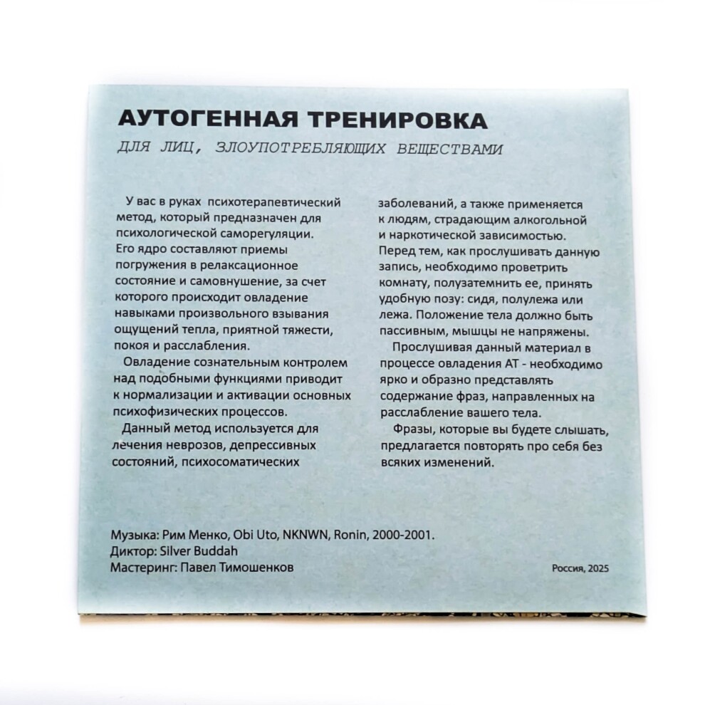 Перед Вами - Аутогенная тренировка для лиц, злоупотребляющих веществами (аудио - психотерапевтический метод, который предназначен для психологической саморегуляции).
